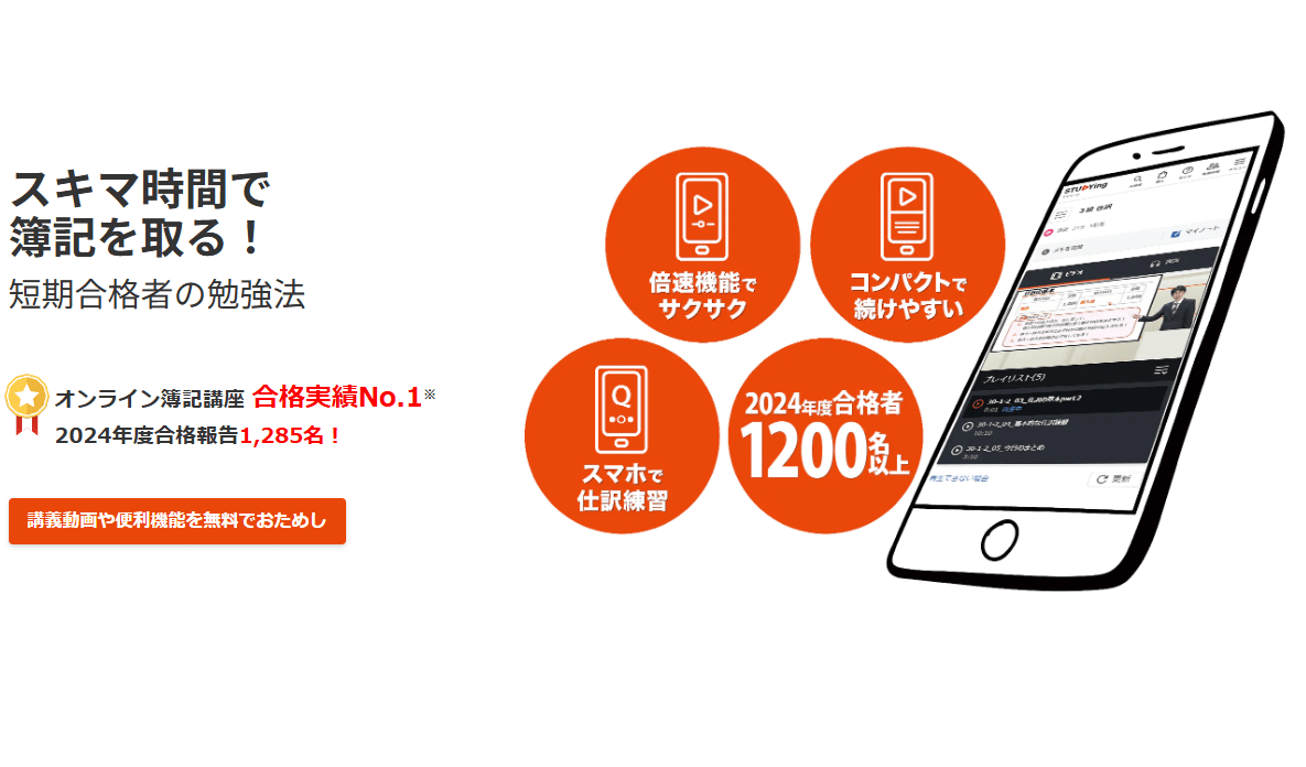 スタディングの簿記通信講座は、スマホ1台でどこでも学べるオンライン完結型が特徴です。
