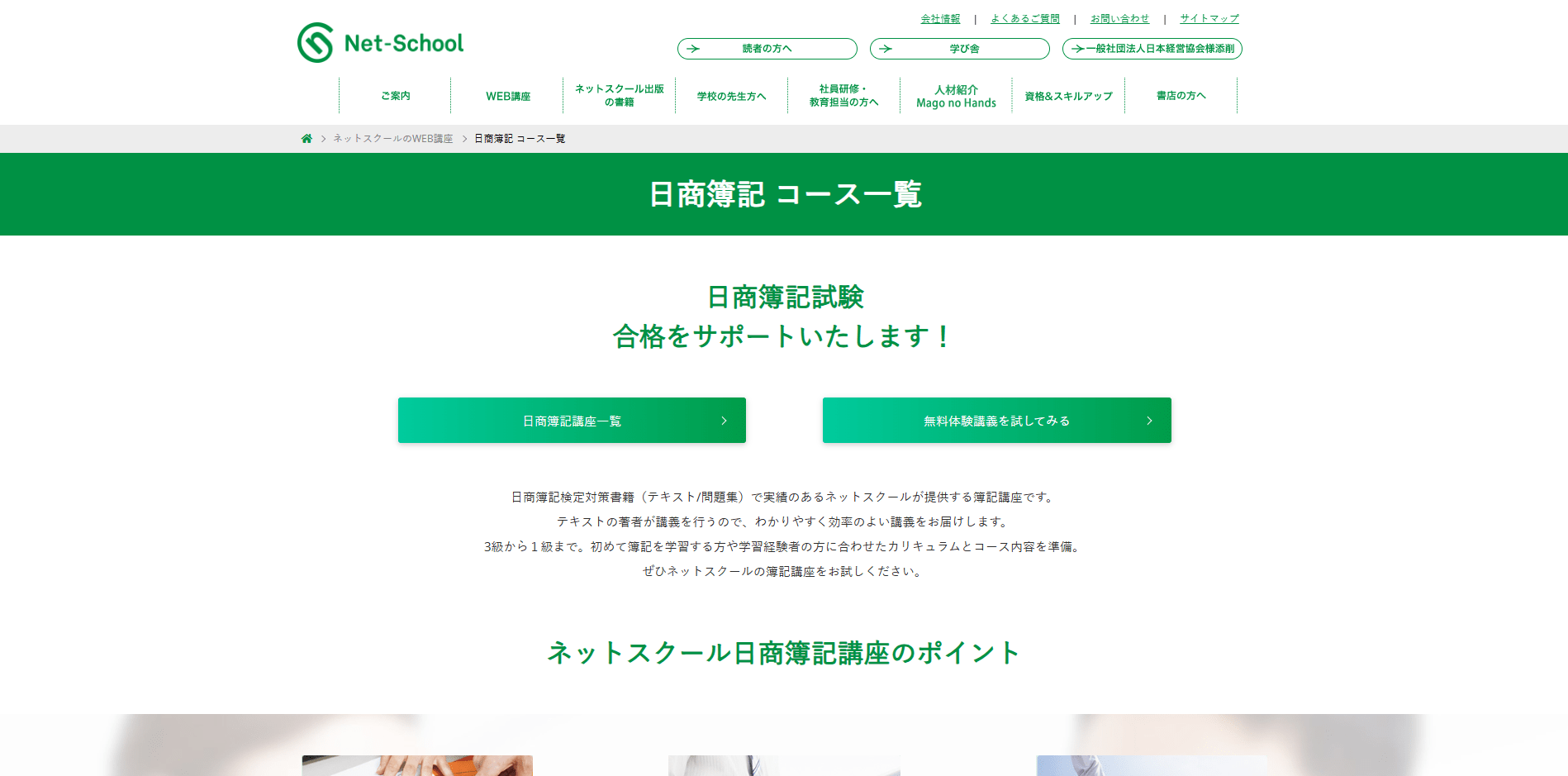 ネットスクールは、簿記対策の教材制作の実績が長いWeb講座で、3級・2級・1級まで対応したカリキュラムを展開しています。