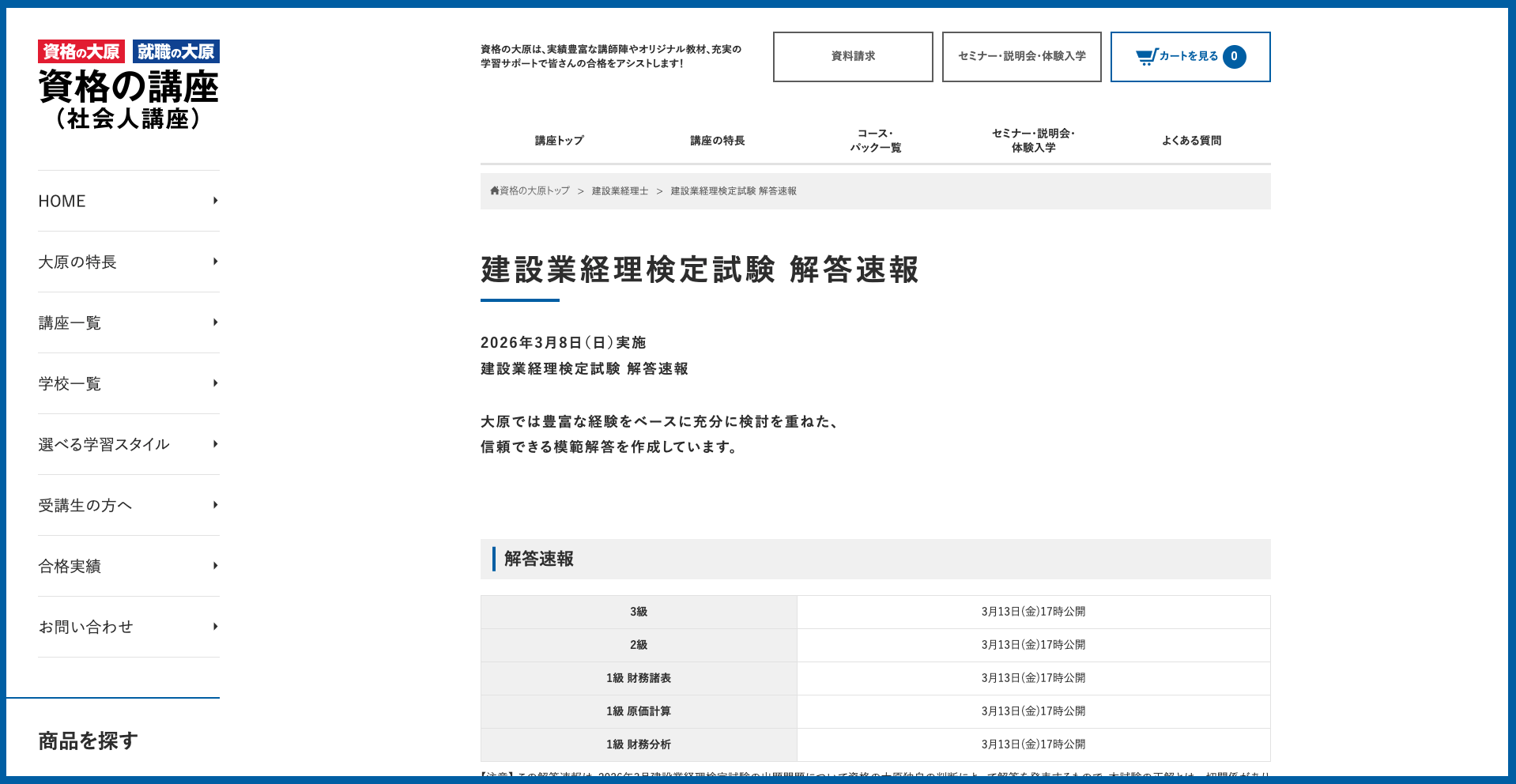 資格の大原では、第38回建設業経理士検定(2級・1級)の解答速報が、試験5日後の2026年3月13日(金)17時ごろに公開される予定です。