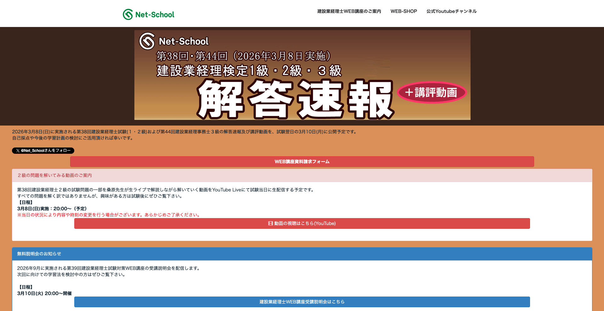 ネットスクールでは、第38回建設業経士検定(2級・1級)の解答速報と講評動画が、試験翌日の3月9日に公開される予定です。