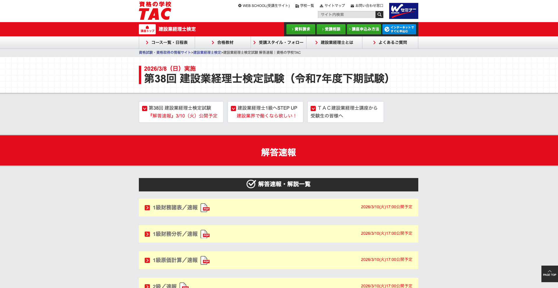TACでは、第38回建設業経理士検定(2級・1級)の解答速報と解答解説(PDF)が、試験2日後の2026年3月10日(火)に公開される予定です。