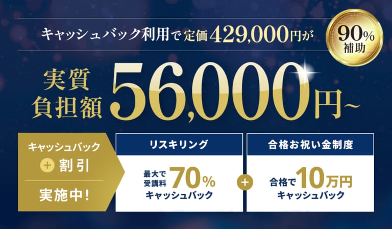 ・リスキング制度で最大70%キャッシュバック(条件あり) ・全科目合格で100,000円キャッシュバック ・他資格合格者割引 |