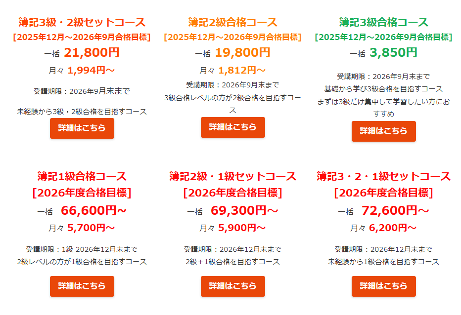 | 通常料金 | 簿記3級・2級:61,800円〜 (サポート期間により変動) |
