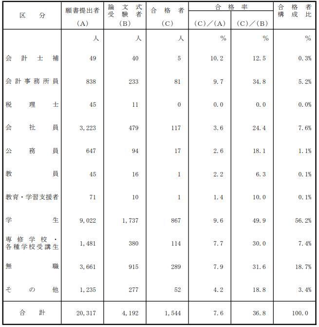 このうち「会計士補/会計事務所員/税理士/会社員/公務員/教員/教育・学習支援者」を社会人と定義した場合、受験者数は883人、合格者数は222人で、合格率は25.1%でした。